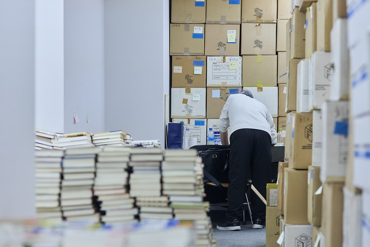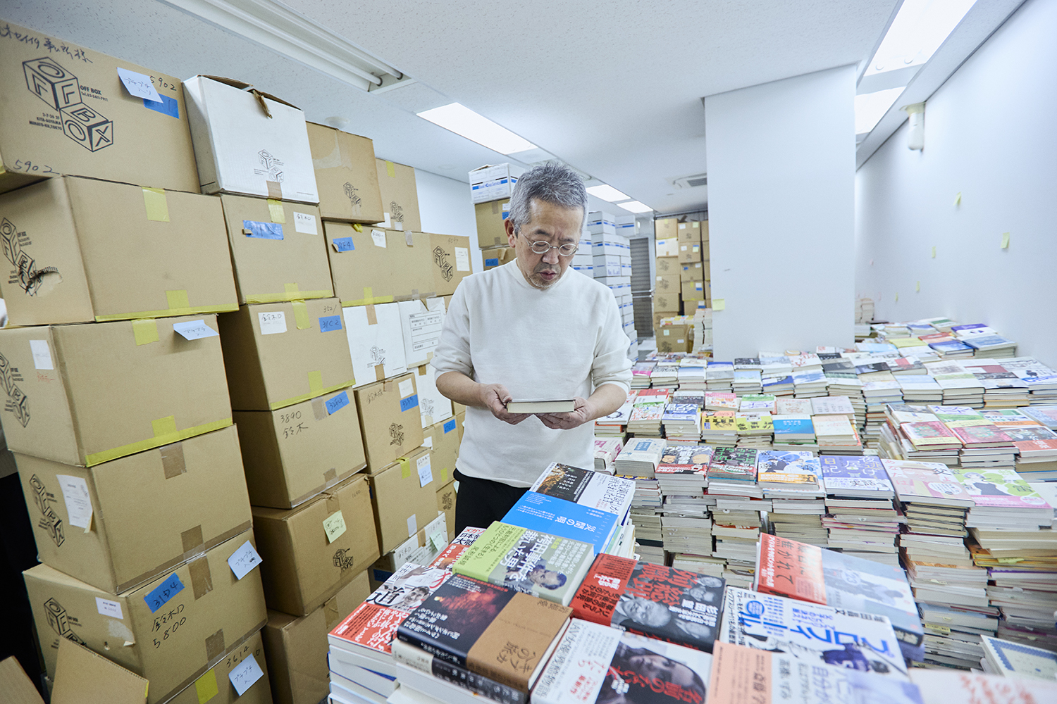 小学館の倉庫で展示のためのセレクト作業中の鈴木さん。撮影:上村窓