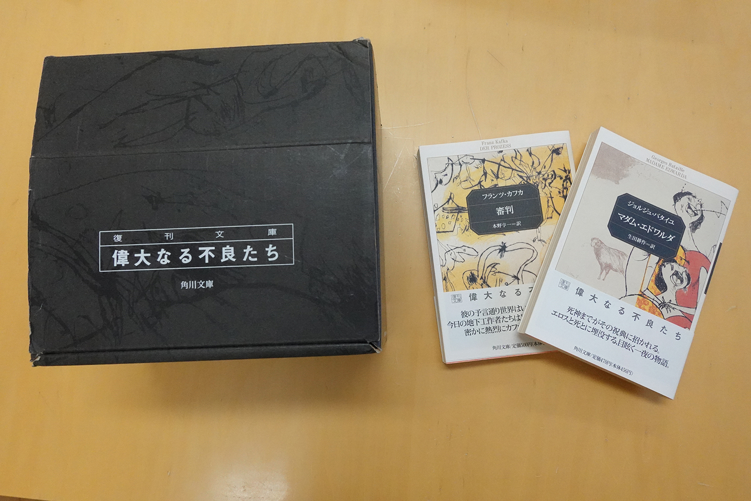 『復刊文庫 偉大なる不良たち 全12巻揃・セット函入』(角川文庫・1992年)。カフカ、コクトー、ボードレールほか、西洋文学の問題児たちの作品を集めた記念セレクション。「不良」というテーマに対して池田満寿夫という反骨心にあふれた版画家の絵を使った