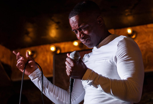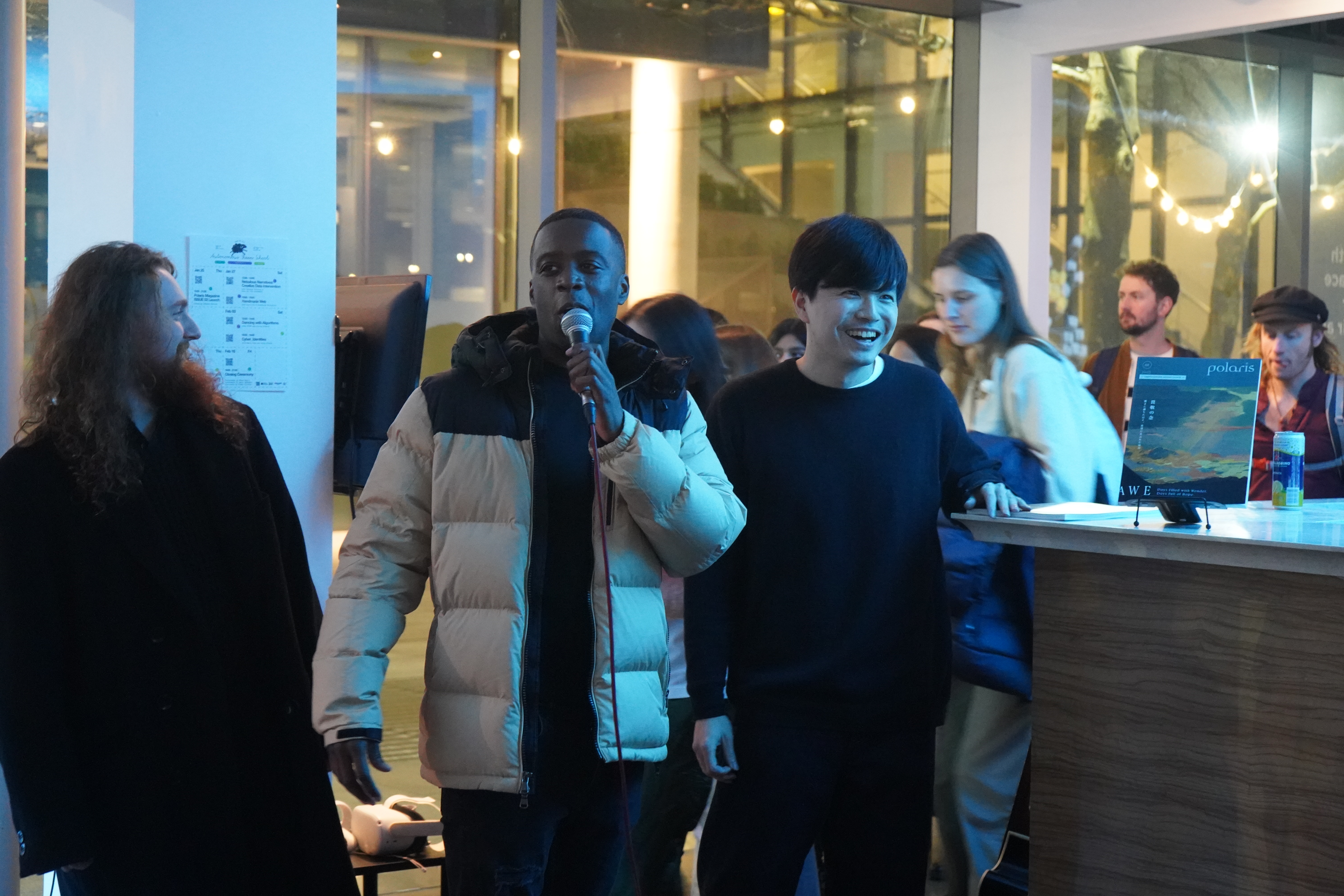 ロンドン、ユーストンのハイファ・ギャラリー。polaris Issue02のローンチイベントの様子。InHouse Recordsのメンバーがギグをした。マイクパフォーマンスをするC・ルーツ(中央)とイギリスで仲間になってくれたライターのアレックス(左)